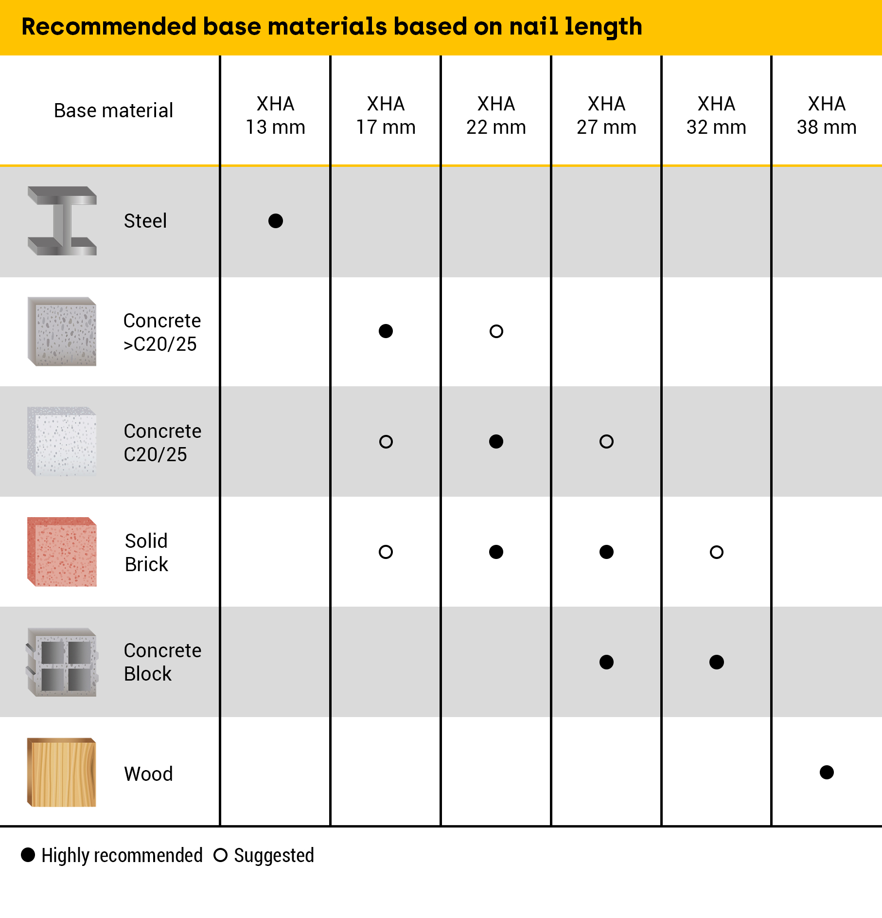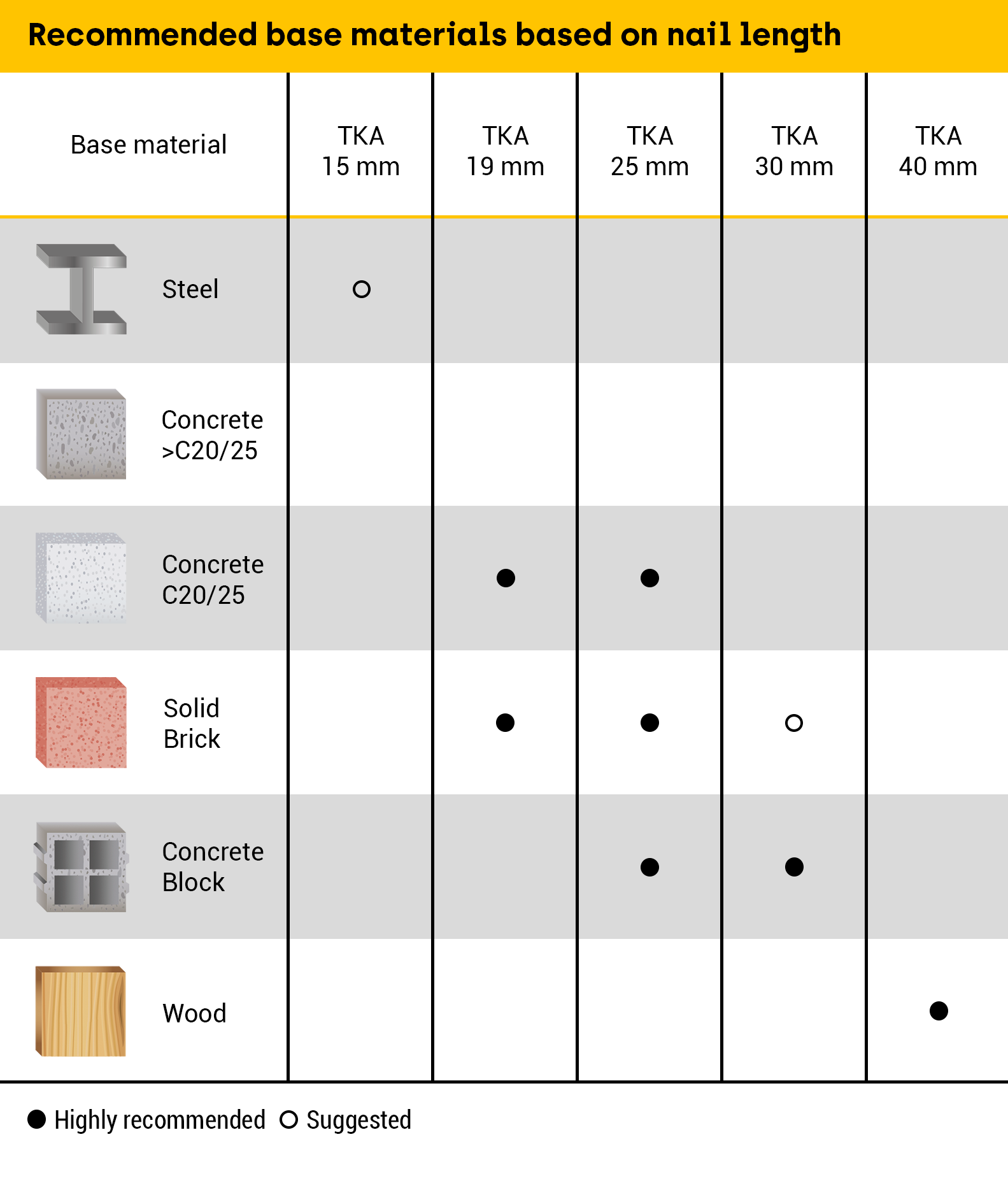 The length of the nail depends on the base material. The harder the base material, the shorter the nail should be to avoid bending or damaging the integrity of the nail. A full list of lengths for each base material can be found below.
