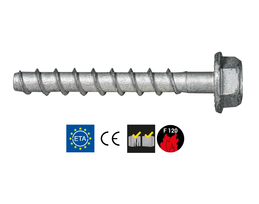 Concrete screws with hexagon head are suitable for applications where the head of the screw can rest on the surface of the object to be fastened. The head makes it easier to screw in and tighten the screw.